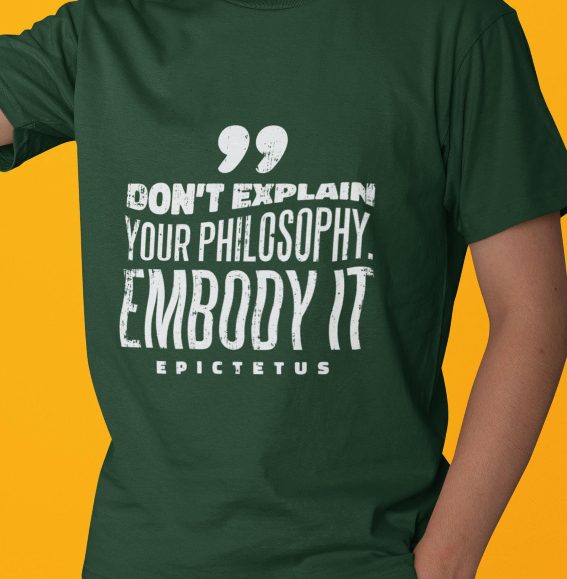"Wrap yourself in wisdom with our 'Don't Explain Your Philosophy, Embody It' tee, inspired by the timeless words of Epictetus. Let your actions speak volumes as you embrace the essence of Stoic thought. This shirt isn't just clothing; it's a manifesto of living with purpose and authenticity. Wear it proudly and inspire others to embrace their inner philosopher."